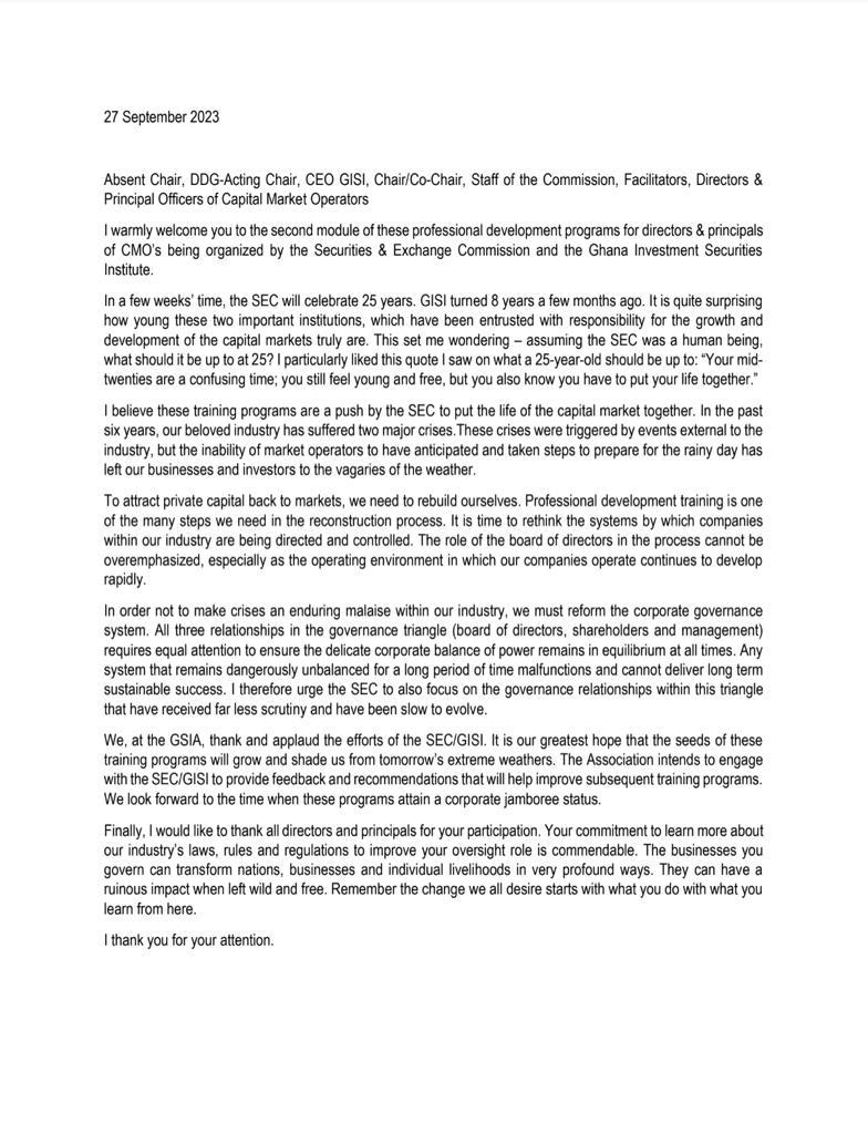 Remarks by the President of the GSIA - 2023 SEC & GISI Training for Directors and Principal Officers of Capital Market Operators